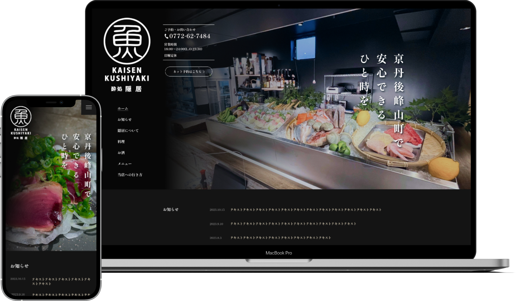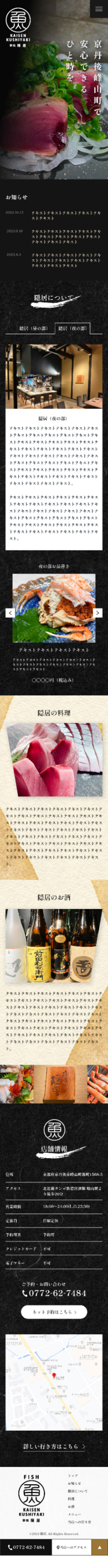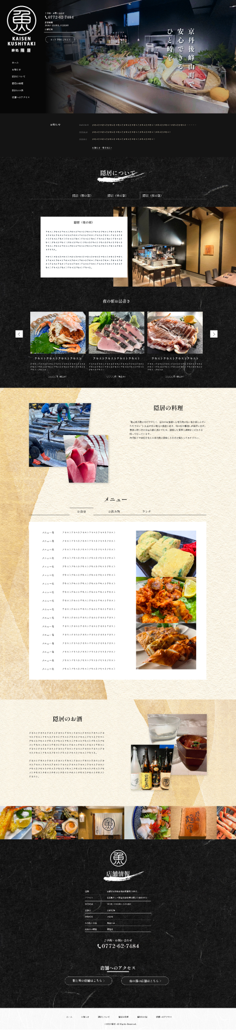 - 地元の漁師から直接仕入れて、地元の食材をメインで利用を提供していることをふまえたので、食材や店の雰囲気を質良く伝わるようなサイトを目指しました。配色はモノクロをメインに用いて、写真がより際立つようにデザインさせていただきました。