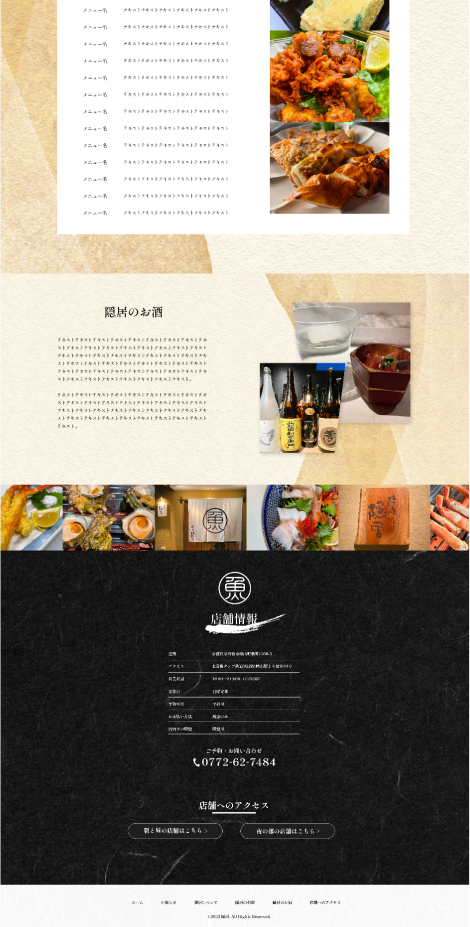 - 食べログには掲載しているが、店舗までの道のりが分かりづらくHPを作りたいので、店舗に関してお問い合わせをいただくことが多い点、食材を問い合わせを減らしつつ、全体の魅力を伝わるように信頼感と高級感のあるサイトを作ってほしい。
